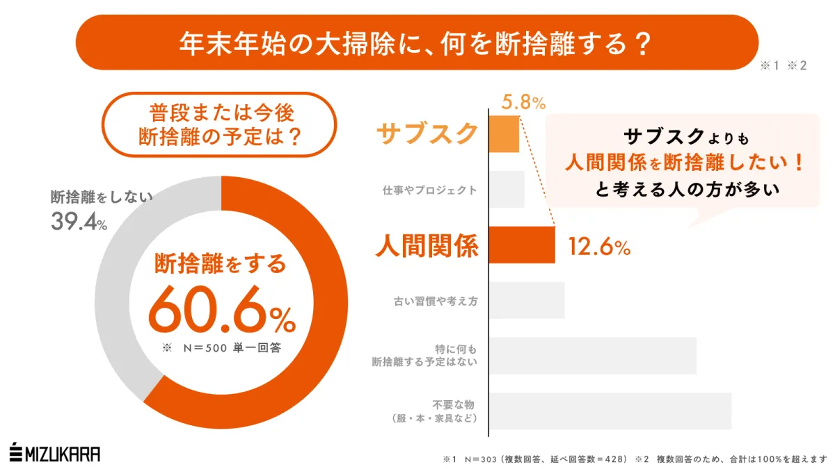 今年の年末年始を迎えるにあたり、株式会社ミズカラが行った調査によると、実に約6割の人が「断捨離をしたい」と考えていることが明らかになりました。この調査では、25歳から59歳の有職者を対象にしており、特に注目すべきは「人間関係」を整理したいとの声が多かった点です。