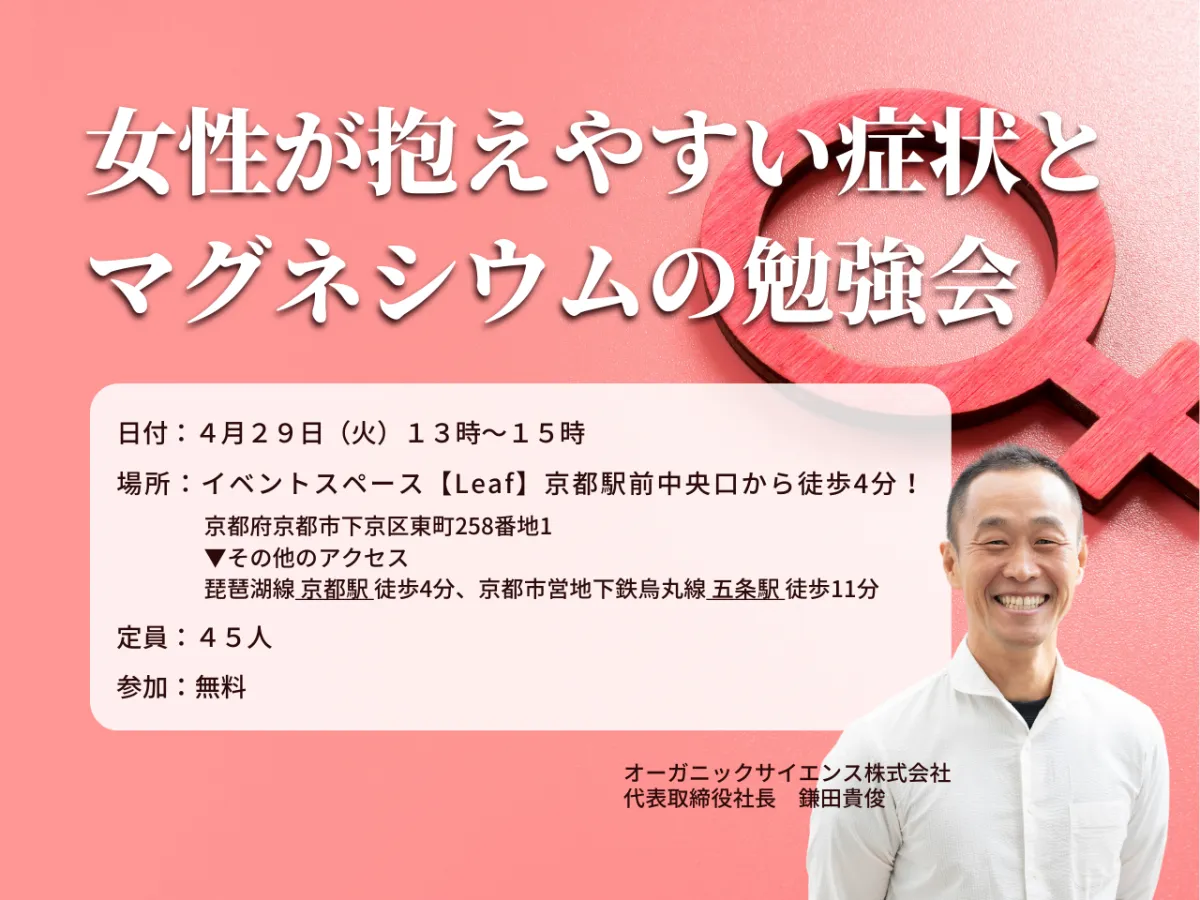 2025年4月29日、京都駅近くで開催される勉強会が注目を集めています。この勉強会の目的は、女性が抱える特有の健康問題に対して、マグネシウムの重要な役割について学ぶことです。主催するのは、東京都千代田区に本社を構えるオーガニックサイエンス株式会社。代表取締役の鎌田貴俊氏が、最近の研究に基づいた知見を参加者に提供します。