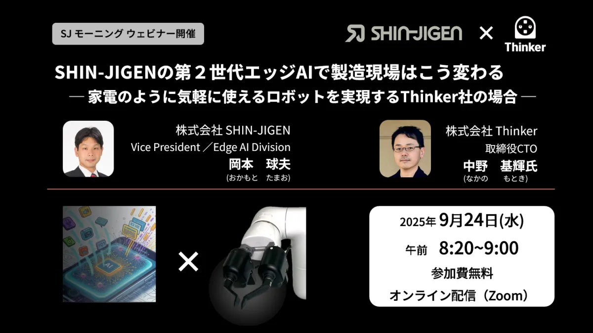 今回、この革新を直接体験できるウェビナーが2025年9月24日(水)に開催されます。特に、SHIN-JIGENのバイスプレジデント岡本球夫氏とThinkerのCTO中野基輝氏が登壇し、ロボティクスとエッジAIのシナジーについて語ります。 参加は無料で、事前登録制となっているので興味のある方はお早めに申し込みをおすすめします。