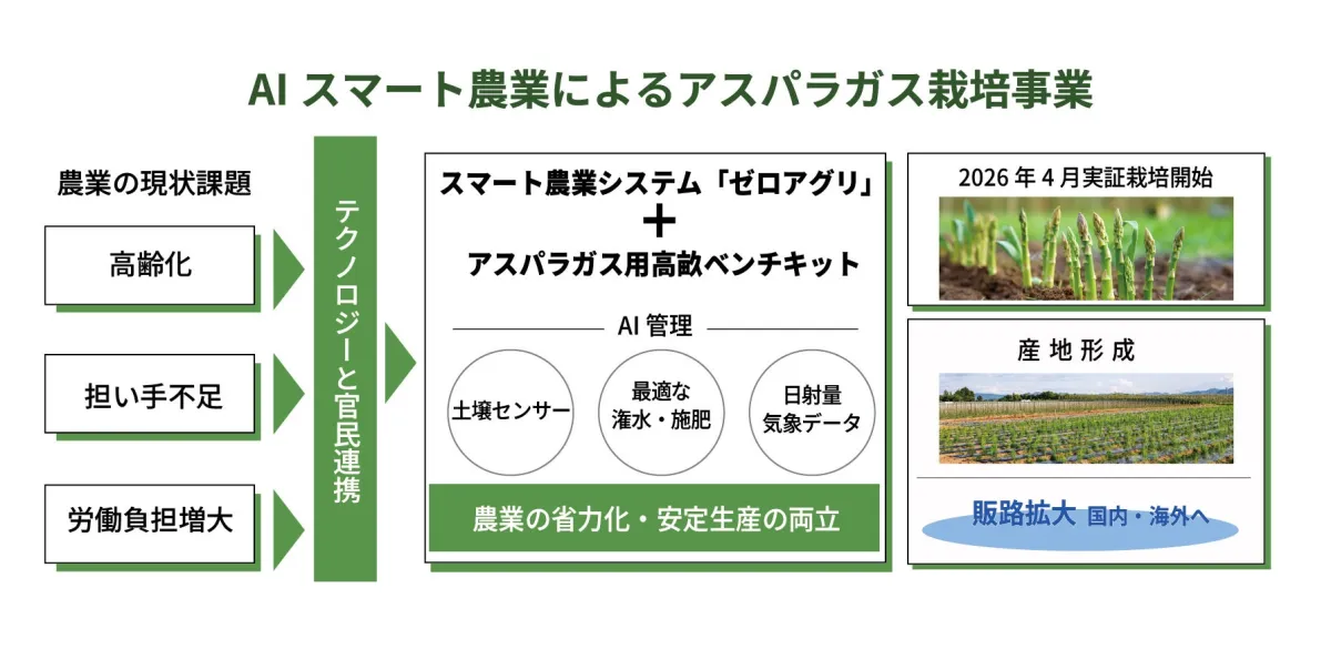 カメイ株式会社(本社:宮城県仙台市、代表取締役社長:亀井昭男)は、宮城県刈田郡蔵王町にて、AI技術を用いたスマート農業システム「ゼロアグリ」を導入し、新たなアスパラガス栽培プロジェクトを開始することを発表しました。この取り組みは、日本の農業が直面する様々な課題解決を目指しており、2026年4月に実証栽培を開始する予定です。2027年度には段階的に事業化を進め、さらなる販路拡大を見据えています。