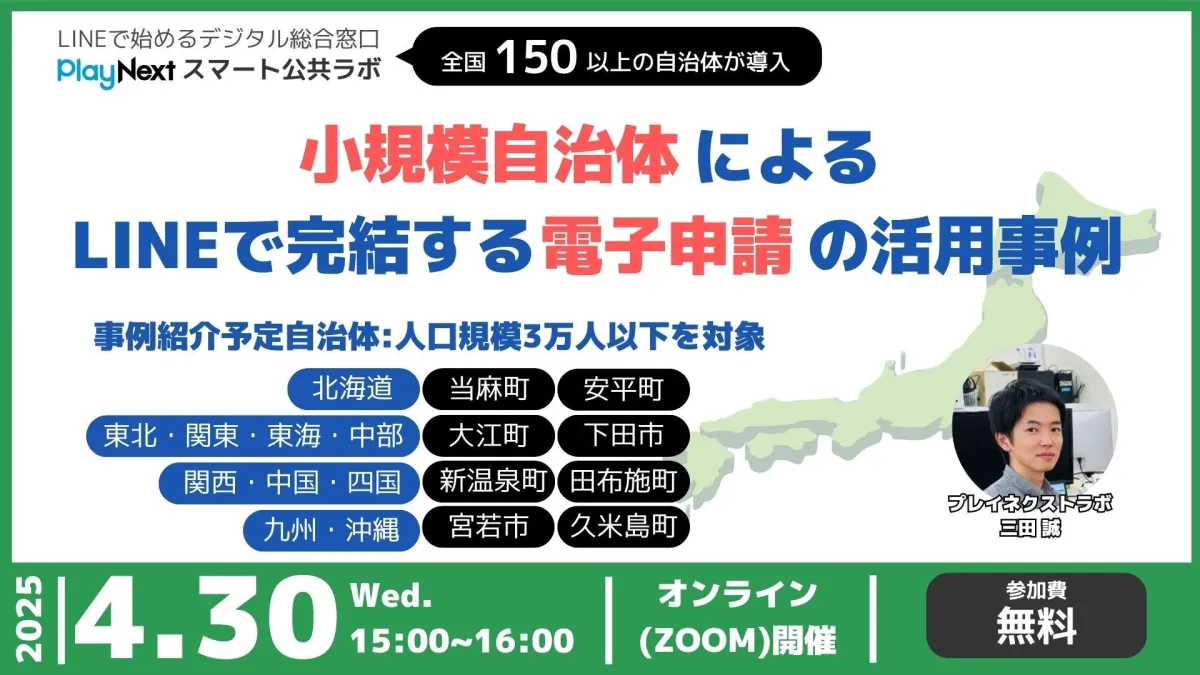 2025年4月30日(水)、プレイネクストラボ株式会社が主催する「第20回スマート公共ラボ活用事例セミナー」がオンライン開催されます。本イベントは、行政DXサービスであるスマート公共ラボの最新の活用事例を紹介し、小規模自治体におけるLINEを利用した電子申請の導入経緯と具体的な成功事例をシェアする貴重な機会となります。