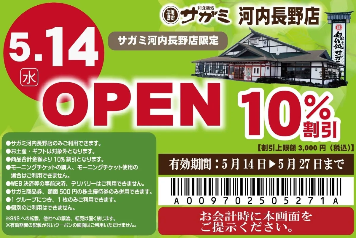 2025年の5月14日(水)、株式会社サガミホールディングスのグループ企業であるサガミレストランツが、新たに「和食麺処サガミ河内長野店」をグランドオープンします。所在地は大阪府河内長野市三日市町214で、営業時間は11:00から22:00まで(ラストオーダーは21:30)となっています。電話番号は0721-69-7220です。