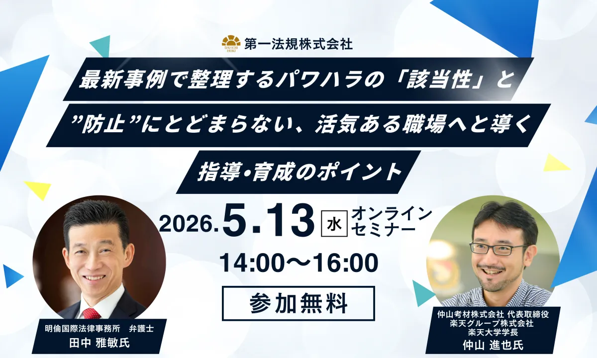 2026年5月13日、水曜日に行われる無料オンラインセミナーには、パワーハラスメントに関する最新の事例を用いながら、その該当性を整理し活気ある職場を実現するための指導・育成のポイントが解説されます。このセミナーは、特に人事労務・法務担当者や管理職の方々にとって、非常に実用的な内容となっています。