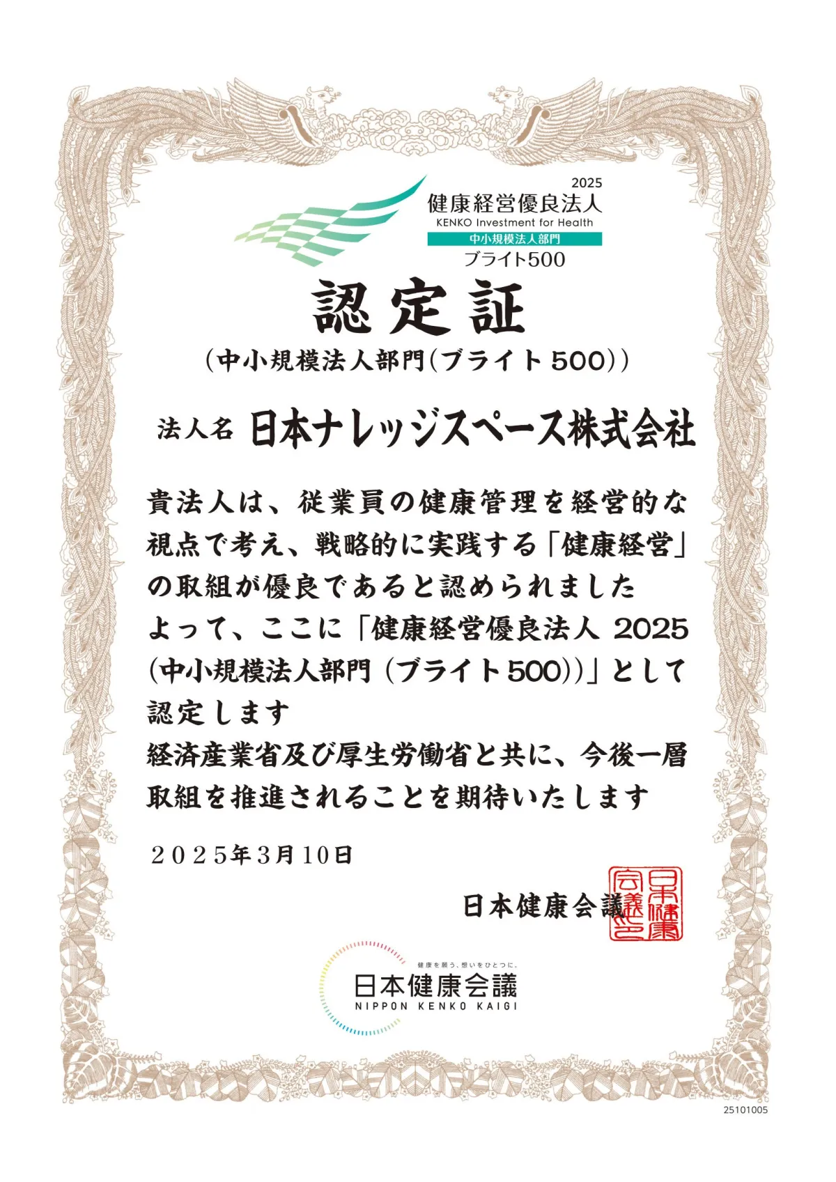 日本ナレッジスペース、4年連続で「健康経営優良法人2025」に認定