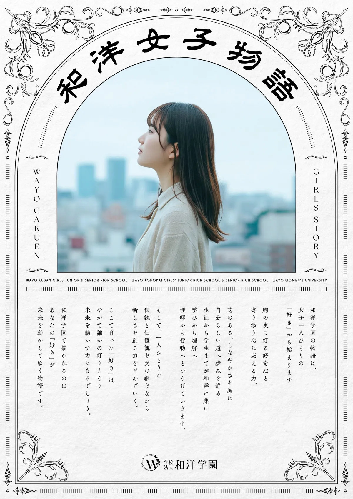 具体的には、キービジュアルが高校生や大学生を主人公にしており、都市の風景をバックに未来を見つめる横顔を描くことで、彼女たちが「自分の好き」を起点に学び、社会へと羽ばたいていく姿を象徴的に表現しています。これにより、和洋学園が大切にしている「伝統」と「現代性」の融合が視覚的にも訴求しています。