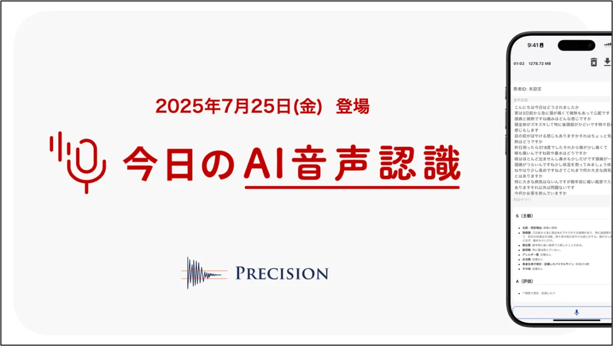 株式会社プレシジョンは、医療現場での業務効率化を目指し、診察室向けのAI音声認識アプリ『今日のAI音声認識』を2025年7月25日に正式にリリースします。このアプリは、医師と患者の会話をリアルタイムで音声認識し、カルテの下書きを自動生成、さらに電子カルテへと自動入力できるという革新的な機能を兼ね備えています。