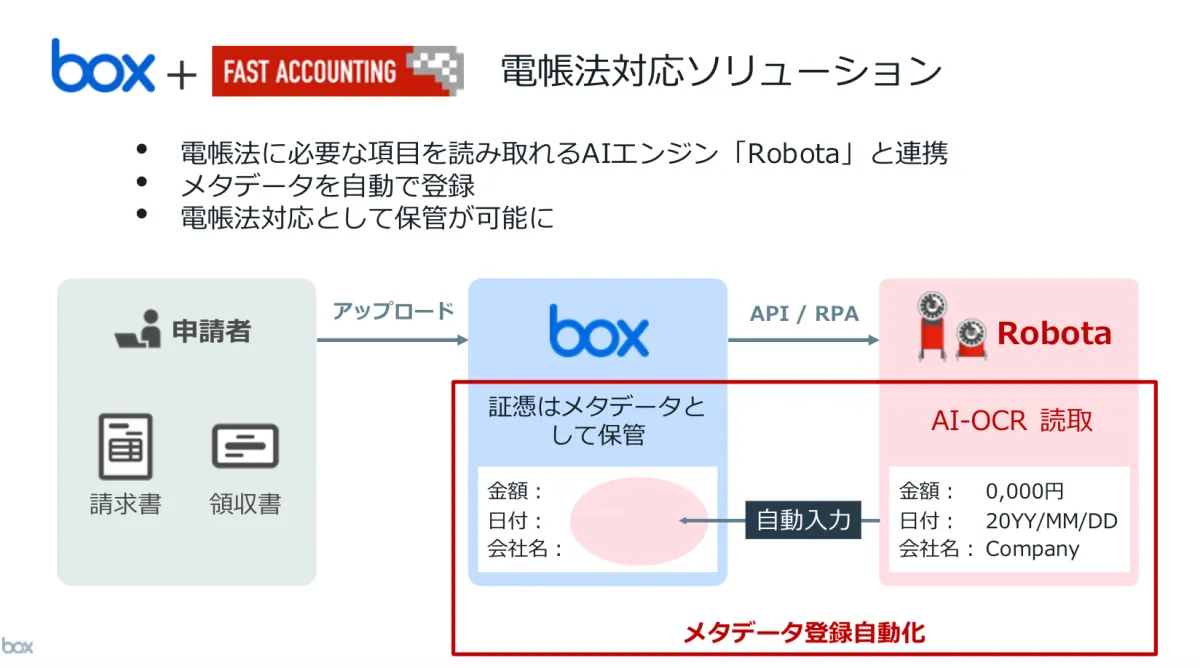 今回のソリューションは、Boxのエコソリューション集に新たに追加され、電帳法に対応した書類の自動読み取りが特徴です。具体的には見積書、発注書、納品書、請求書などの国税関連書類をBox上にアップロードすることで、AI-OCR技術が自動的にメタデータとして登録します。この過程により、手動での入力作業が大幅に削減され、効率的なデータ管理が可能になります。