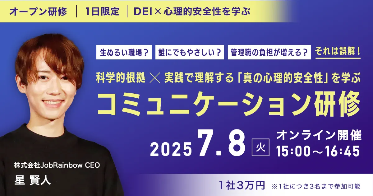 株式会社JobRainbowが提供する「真の心理的安全性」を学ぶオープン研修が、2025年7月8日にオンラインで開催されます。この研修は、企業が多様性を推進するうえで欠かせない「心理的安全性」を理解し、組織のコミュニケーションを改善するために企画されました。