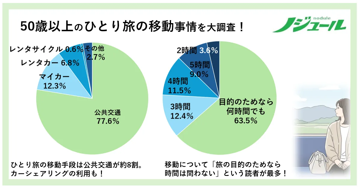 近年、50歳以上の世代において「ひとり旅」が浸透し、旅行スタイルの一つとして受け入れられています。株式会社JTBパブリッシングが出版する月刊誌『ノジュール』は、50歳以上の読者を対象に、ひとり旅の移動に関するWEBアンケートを実施しました。その結果は、ひとり旅が持つ魅力や、どのようにこれを楽しんでいるかを明らかにしています。