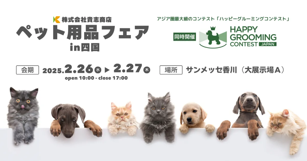 2025年2月26日(水)、27日(木)に、香川県のサンメッセ香川にて「2025ペット用品フェアin四国」が開催されます。この展示会は、ペットと共に暮らす人々やペットのための仕事をしている人たちに向けて、多くのペット用品が集まるイベントです。主催は、徳島県徳島市に本社を構える株式会社貴志商店です。
