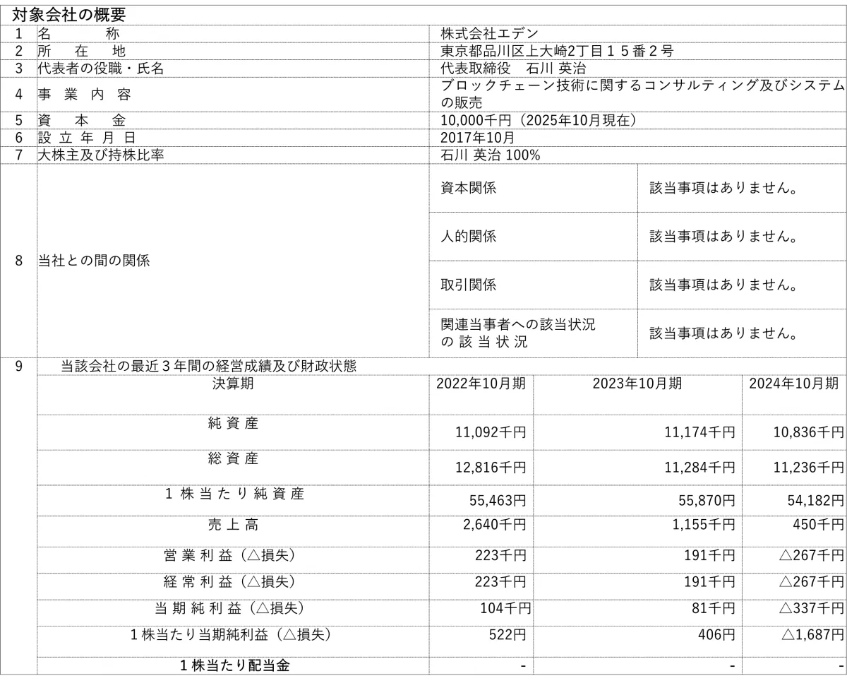 最近、株式会社エデンの株式譲渡契約が進展し、 2025年5月に行われた基本合意書の締結に基づいて、当社は株式を取得し子会社化する準備を進めています。具体的には、株式会社ミライキャピタルホールディングス(MCH)と連携し、株式譲渡に向けた準備を整えてきましたが、近時の経過により、当初の予定とは若干異なる形で契約の締結と第1回株式譲渡を実施することになりました。