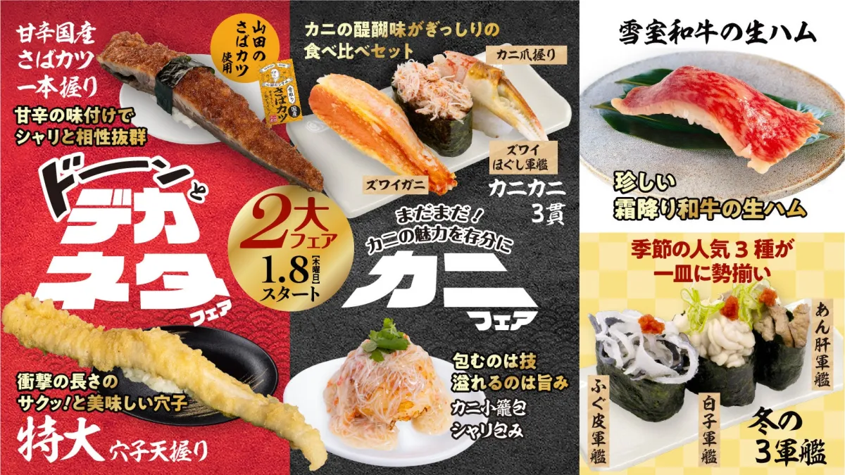 寒さが厳しくなるこの季節、温かい料理が恋しくなります。1月8日(木)より、回し寿司「活」と「寿司活」にて、冬限定メニューとして「デカネタフェア」と「カニフェア」の2つの大人気フェアが同時にスタートします。新年の始まりにぴったりの豪華なラインナップが待っています。