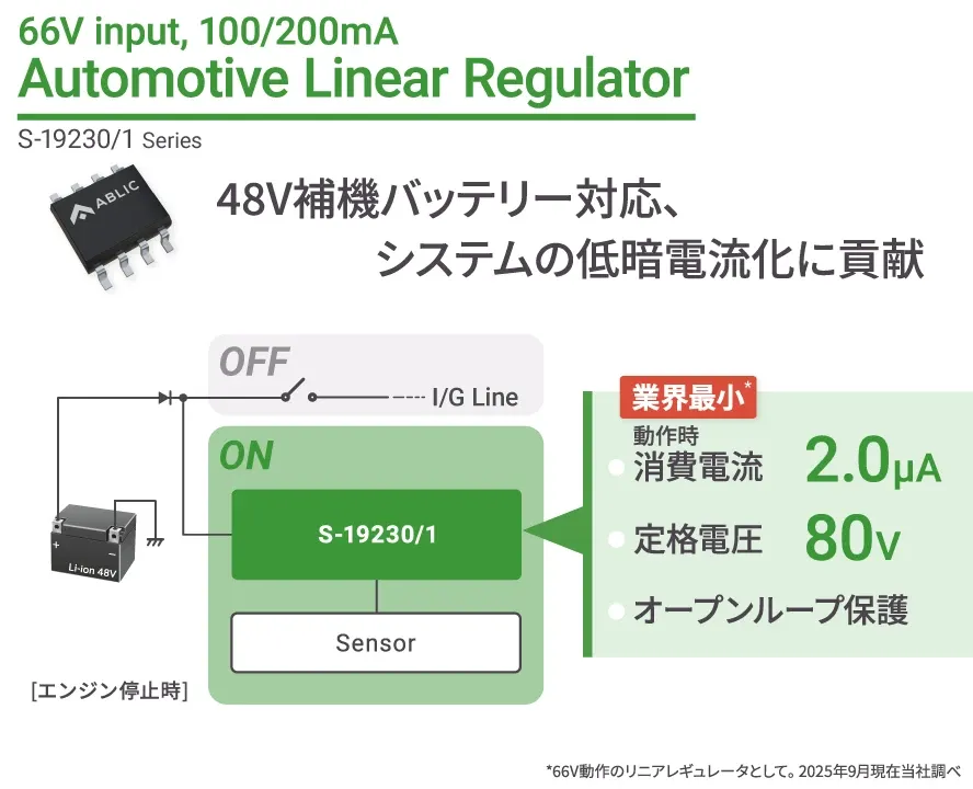 S-19230/1シリーズには80Vの高耐圧があり、48V、24V、12Vの補機バッテリーに対応しています。これにより、センサーやCAN/LINトランシーバーなど、さまざまな用途に対応することが可能です。また、オープンループ保護回路も搭載しており、外部部品のコスト削減や省スペース化にも寄与すると期待されます。この新技術により、これまで必要だった過電圧保護用の外付け部品は不要となり、安全性向上にもつながります。