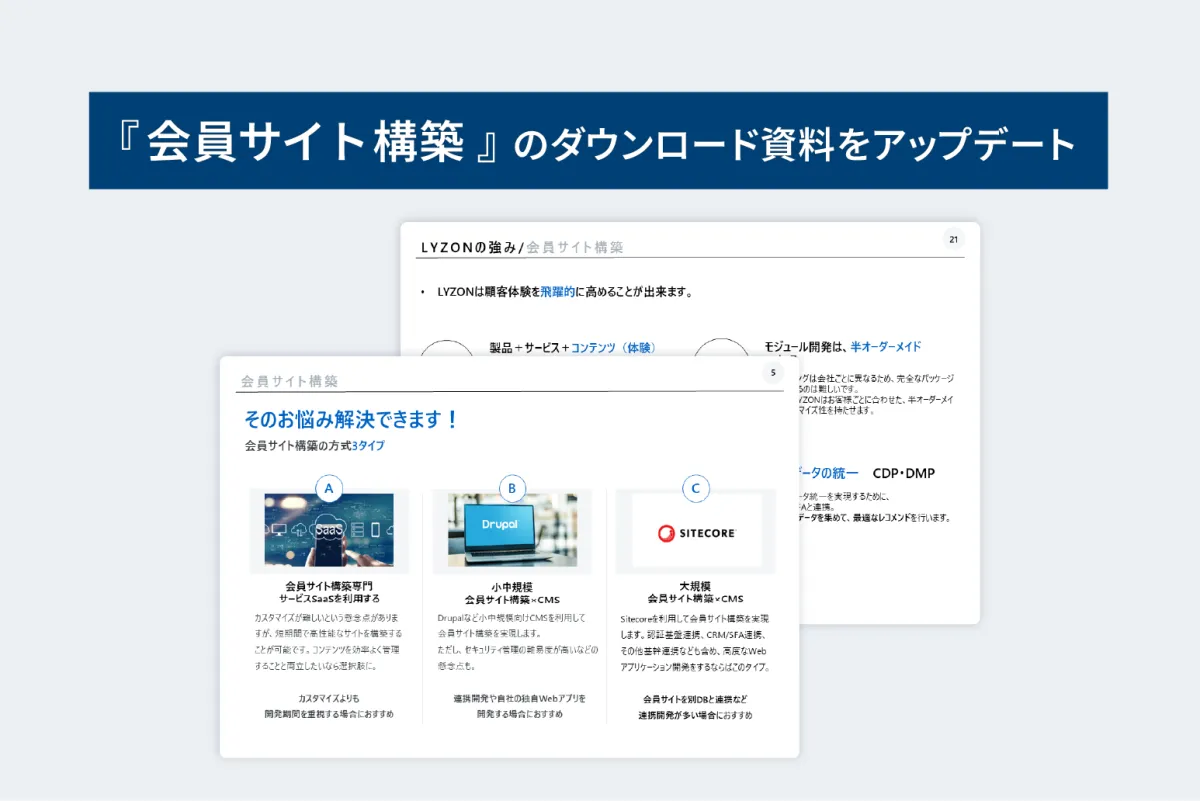 株式会社LYZONは、2023年2月27日に会員サイト構築特集ページのダウンロード資料をアップデートしました。本資料では、マーケティングに強く、拡張性の高い会員サイトの構築方法を詳しく紹介しています。LYZONがこれまで蓄積してきた実績とノウハウを活かし、クライアントのニーズに合った理想のサイト構築を提案します。