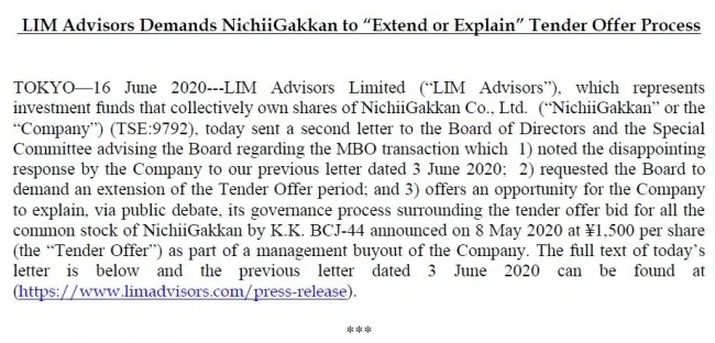 在香港の投資会社、リム・アドバイザーズ・リミテッドは、株式会社ニチイ学館の株主を代理として、同社の取締役会と特別委員会に新たな書簡を送付しました。この書簡では、6月3日に送った前回の手紙に対する不満を表明するとともに、公開買付期間の延長と公開討論の実現を求めています。提案された公開討論は、直近の公開買付けに関する重要なガバナンスのプロセスを説明する絶好の機会となり得ます。
