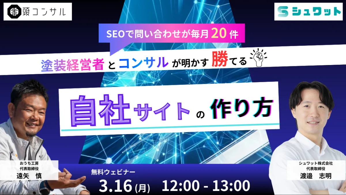 塗装業界の経営者やマーケティング担当者にとって、集客は成功に欠かせない要素の一つです。特に、最近ではSNSやポータルサイトに依存する企業が多い中、シュワット株式会社とおうち工房が提供するウェビナー『塗装経営者とデジマコンサルが明かす 勝てるサイトの作り方』に注目が集まっています。2026年3月16日(月)12時から開催されるこのオンラインウェビナーでは、効果的な集客のためのノウハウが提供されます。