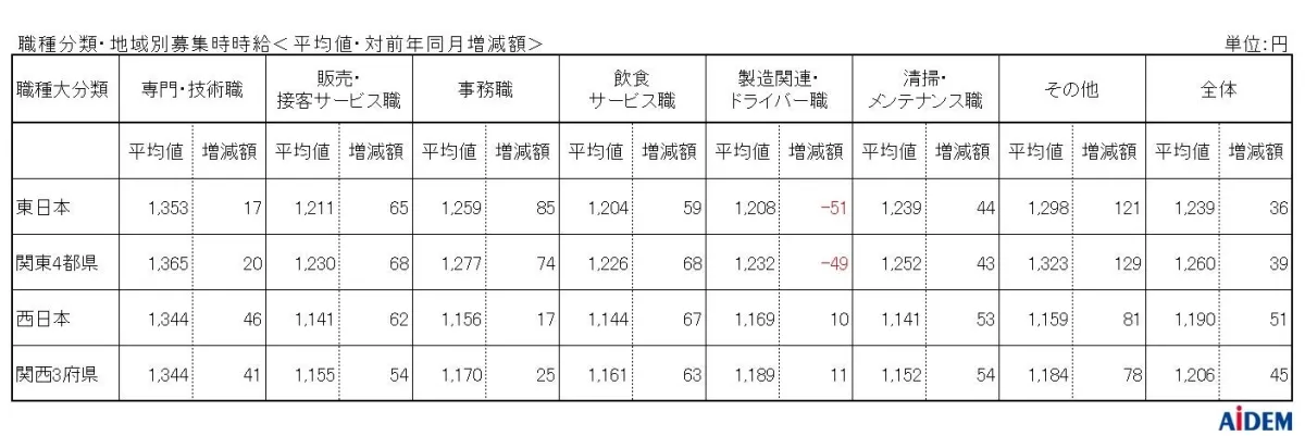 関西3府県での時給は1,206円に上昇し、前年の同月比で45円増加しました。このエリアでも、全ての職種が前年比プラスの評価を受けています。