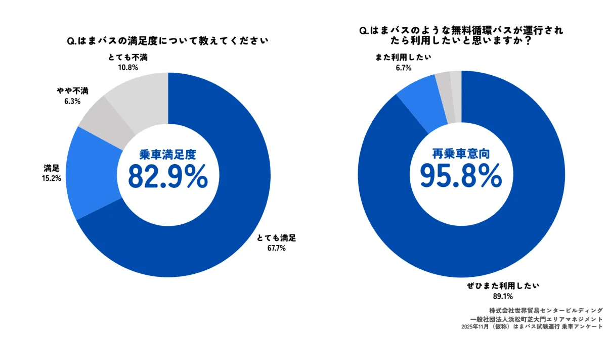 株式会社世界貿易センタービルディングと一般社団法人浜松町芝大門エリアマネジメントは、浜松町エリアの移動利便性向上を目的とした無料循環バス「(仮称)はまバス」の試験運行を実施しました。期間は2025年11月1日から11月14日までの14日間で、約1700名が乗車し、その結果、95.8%の利用者が本格運行への利用意思を示しました。