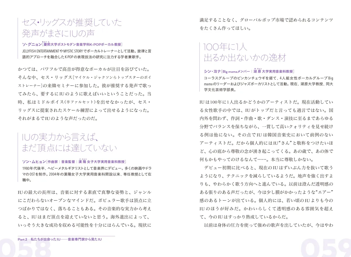 本書では、IUの楽曲を一曲ずつ丁寧に解説し、その歌唱表現や感情の込め方、マイクのテクニックに至るまで細かく分析しています。また、歌手・作曲家・作詞家・ボーカルトレーナー・音楽科教授といった音楽業界の第一線で活躍するプロフェッショナルたちへのインタビューを通じて、IUというアーティストの凄みと彼女の音楽が持つ独自の魅力を多角的に描き出します。