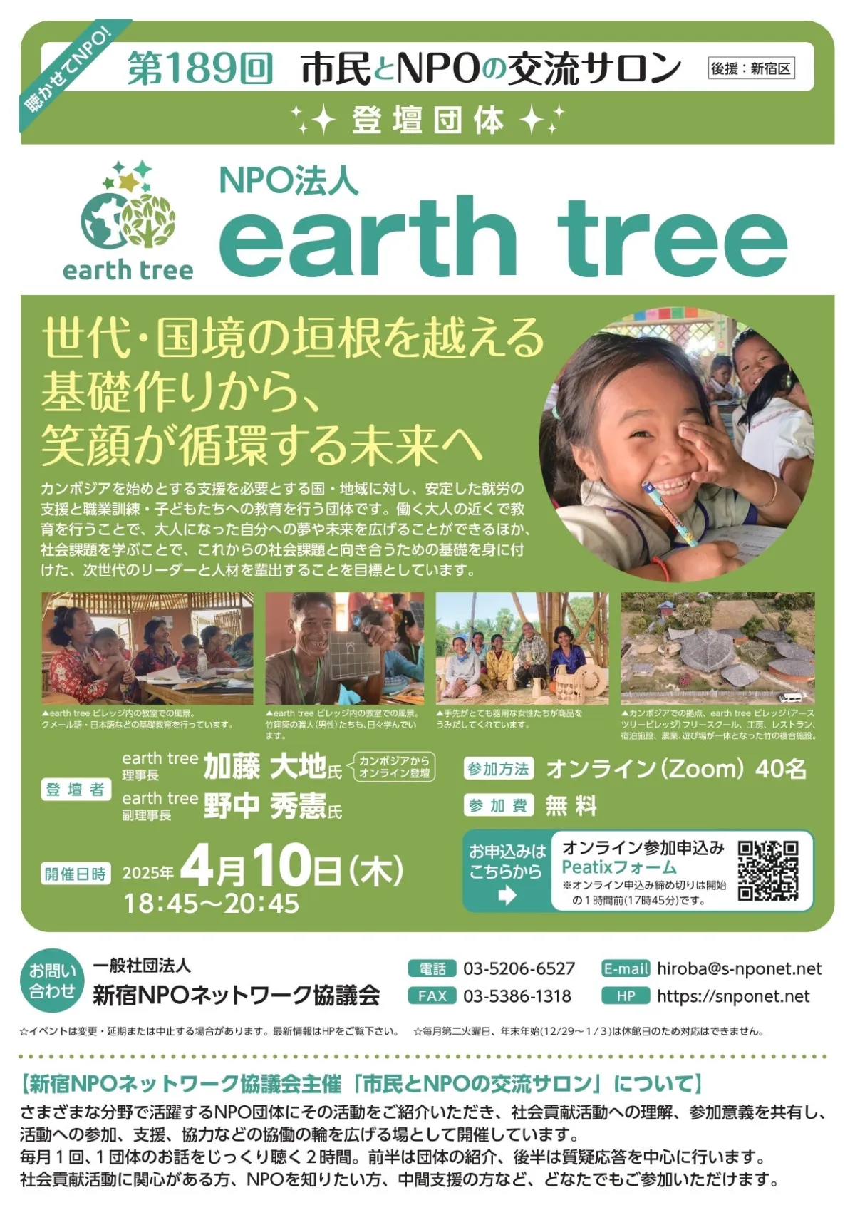 2025年4月10日(木)に行われる第189回市民とNPOの交流サロンでは、特定非営利活動法人(NPO法人)earth treeが登壇します。このイベントは、NPO法人や市民が出会い、理解を深めることを目的とした貴重な機会です。