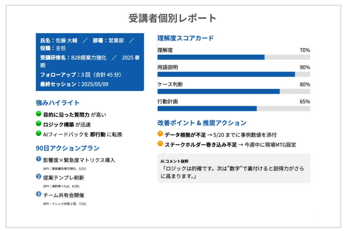 AIが個々の理解度や行動の定着率を数値化し、研修の効果を「測る」ことが可能です。受講者自身も自分の進捗を確認できるため、学ぶ意欲が向上します。