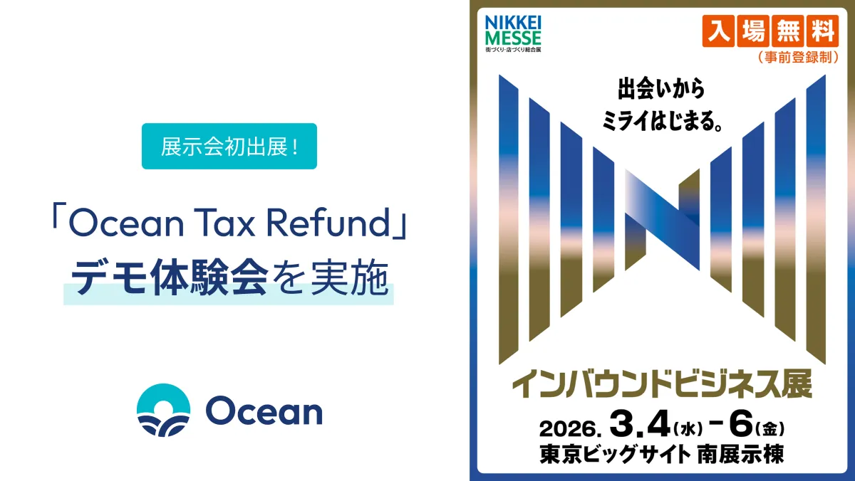 株式会社Oceanは、東京都中央区に本社を置く新興企業で、訪日外国人のお客様に向けたタックスリファンドサービスを展開しています。2026年3月4日から6日にかけて東京ビッグサイト南ホールで開催される「第3回インバウンドビジネス展」に出展し、初めての試みとなるこのイベントで、自社開発の次世代免税サービス「Ocean Tax Refund」をお披露目します。