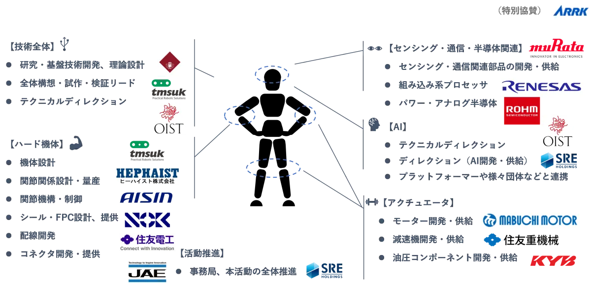 KyoHAには多様な企業と機関が参加しており、株式会社アイシンが新たに参画、さらに株式会社アークが特別協賛として参加しています。また、他の企業や機関からも参加が期待されており、より多くの技術を集めることでヒューマノイドロボットの開発を加速させる計画です。