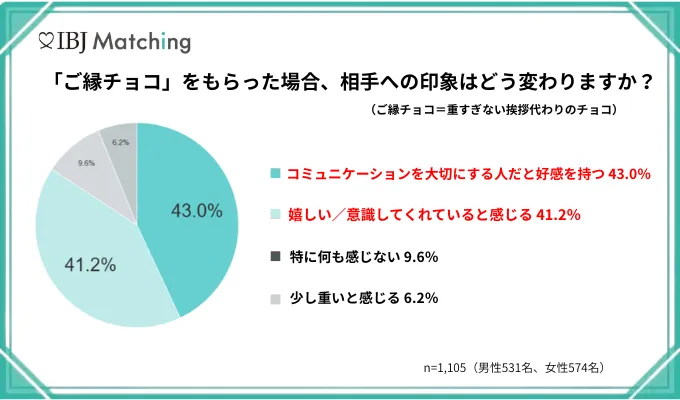 調査によれば、男女ともに「ご縁チョコ」を貰った場合、嬉しい・好印象と答えた割合はそれぞれ86.8%、81.9%に上ります。対照的に、特に何も感じないもしくは重いと感じるという意見は1割未満と、好意的に受け入れられていることが確認されました。この結果は、バレンタインを利用したさりげない気遣いが出会いへとつながる一歩であることを示しています。