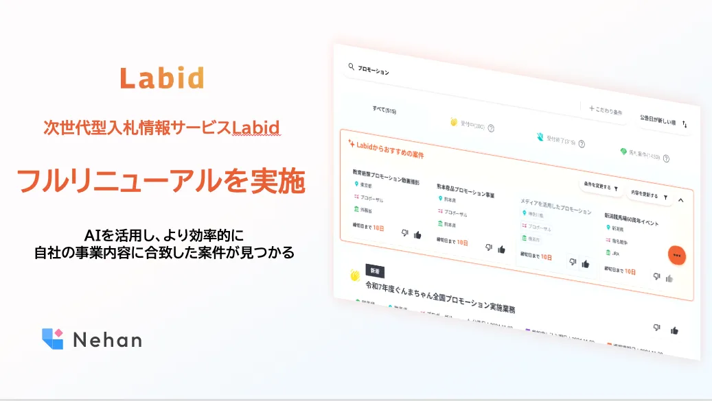 Nehan株式会社が2025年2月1日に次世代型入札情報サービス『Labid』のフルリニューアルを実施した。このサービスは、AI技術を活かし、自社の事業内容に合致した入札案件を容易に探し出すことを可能にする画期的なものだ。