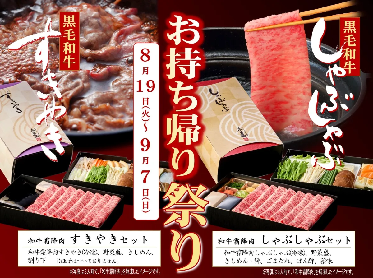今回のお持ち帰り祭りでは、しゃぶしゃぶやすきやきの特別セットが割引価格で提供されます。例えば、しゃぶしゃぶの場合、和牛霜降肉のセットが通常価格6,868円(税込)が5,400円(税込)で購入できます。また、すきやきの同様のセットも、お得な価格で展開されています。