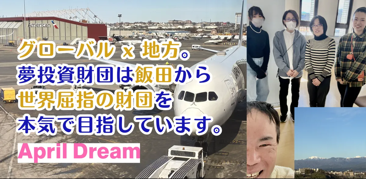 長野県飯田市で設立された一般財団法人夢投資財団は、夢の実現を目指す公共財団への挑戦を続けています。この小さな財団のビジョンは、世界屈指の規模を誇る財団に育て上げることです。たとえば、デンマークのノボ・ノルディスク財団は約27兆円、アメリカのゲイツ財団は約12兆円に達しています。それに比べて私たちは設立から1年余りの新興財団ですが、私たちの夢は大きいのです。