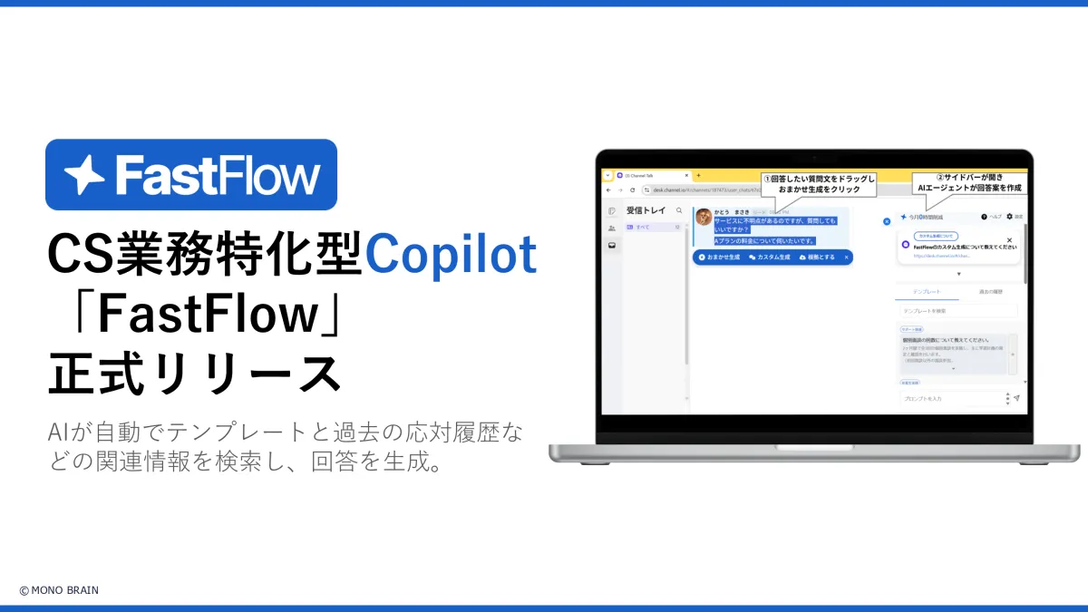 株式会社MONO BRAINが、カスタマーサポート(CS)業務の際効化を図るAI Copilot「FastFlow」を正式にリリースしました。