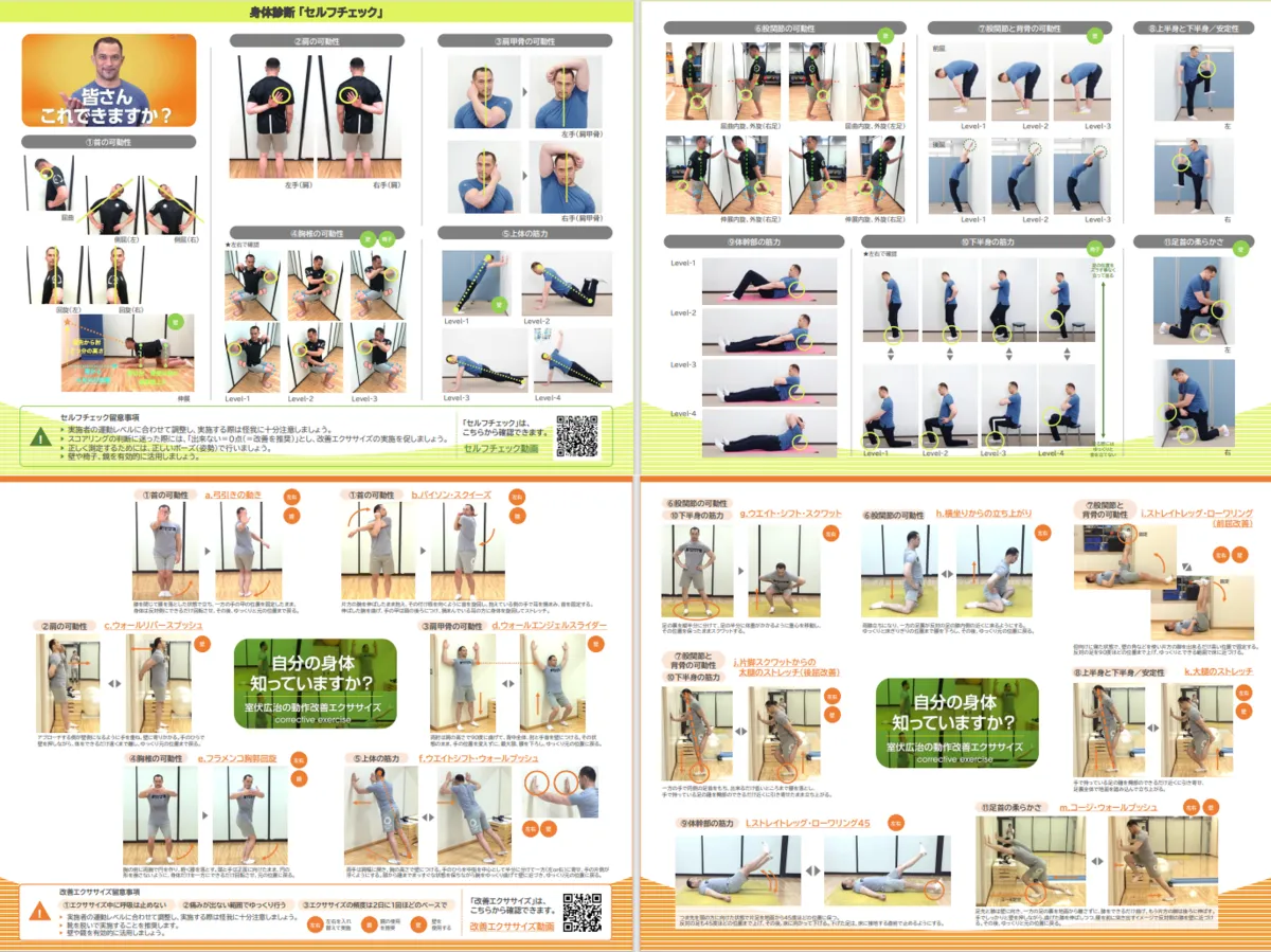 この身体診断は、スポーツ庁前長官の室伏広治氏が考案しました。老若男女を問わず、自分のペースで簡単に身体の状態を把握できるように設計されています。具体的には、自己評価によるチェック項目と、結果に基づくエクササイズが組み合わされています。このメソッドの主な目的は、日常生活の質を向上させることです。
