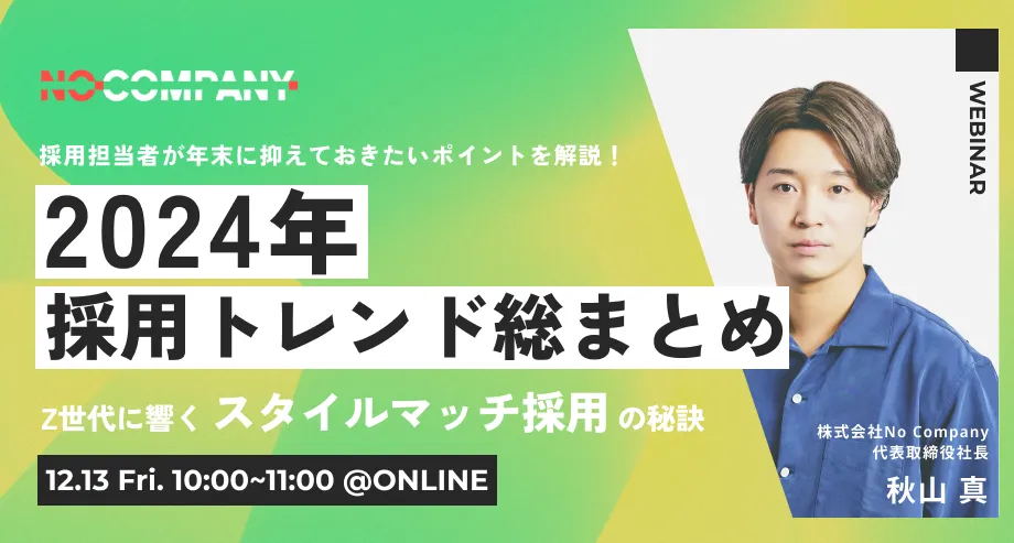 株式会社No Companyが主催する「2024年採用トレンド総まとめセミナー」が、2024年12月13日(金)にオンラインで開催されます。このセミナーは、新卒採用を担う人事担当者にとって見逃せない情報が盛りだくさん。特に、Z世代に響く「スタイルマッチ採用」の秘訣に焦点を当て、具体的な施策や事例を交えて解説します。