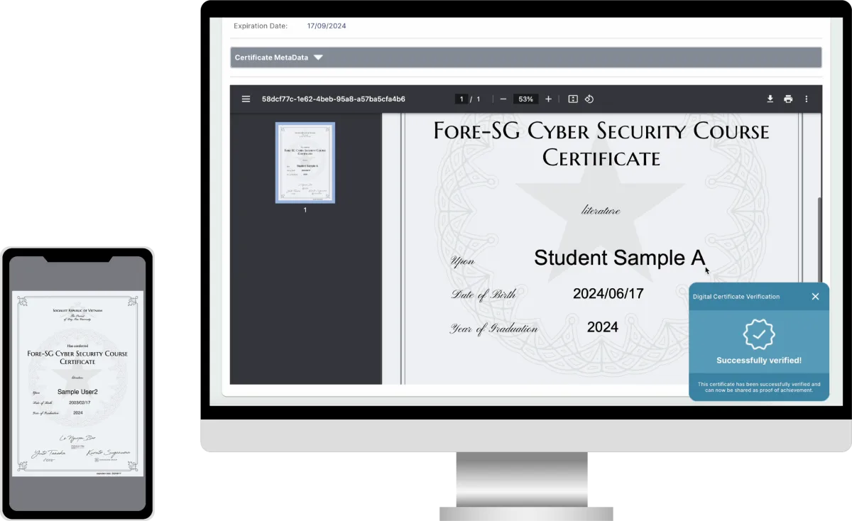 このデジタルバッジシステムはズイタン大学のセキュリティコースで導入されました。教員や大学職員が管理するポータルサイトから簡単に証明書を発行することができ、学生は個別のポータルサイトを通じて証明書をダウンロードします。また、証明書の検証プロセスはフォアーが提供する検証サイトを利用して行うことができ、学生や就職活動者にとって安心感があります。