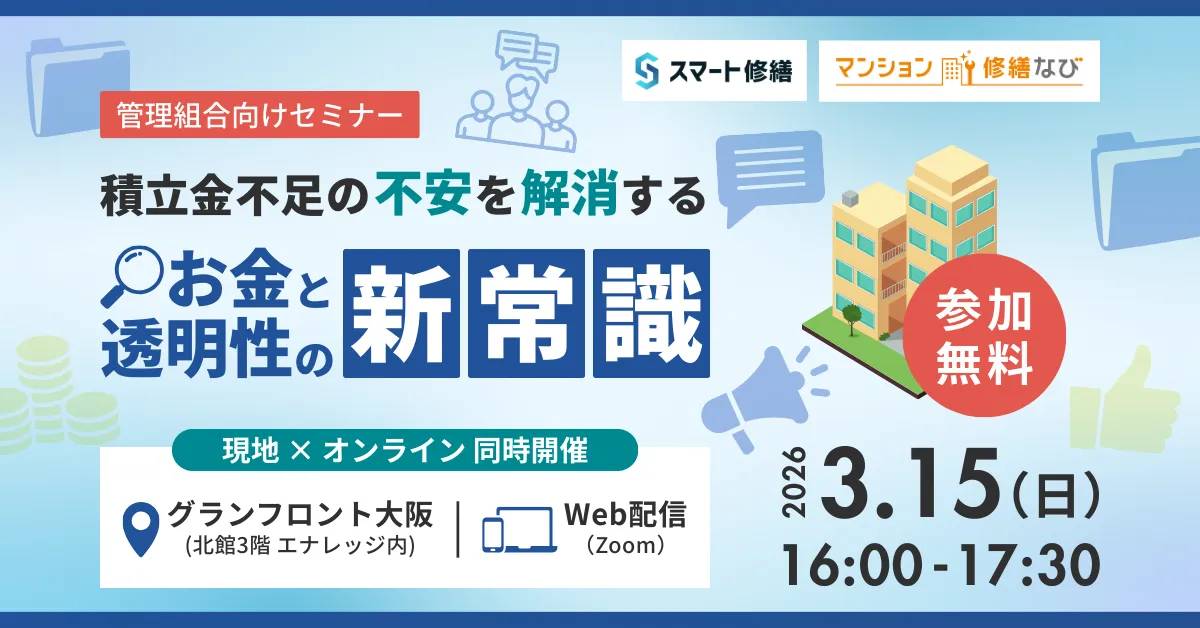 この度、株式会社スマート修繕と株式会社オプテージが連携し、2026年のマンション防衛策に関する無料セミナーを開催します。日付は2026年3月15日、場所は大阪市のグランフロント大阪にて行われます。マンション管理組合における積立金不足の問題に対処し、透明性を確保する新常識を知ることができる貴重な機会です。