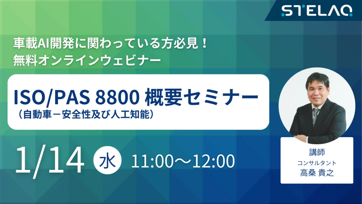 株式会社STELAQは、2026年1月14日、水曜日の11:00から12:00にかけて、無料のオンラインウェビナー「ISO/PAS 8800(自動車-安全性及び人工知能)概要セミナー」を開催します。本セミナーは、急速に発展する自動車産業におけるAIの活用方法とその安全性について、最新の国際標準を学ぶ良い機会です。