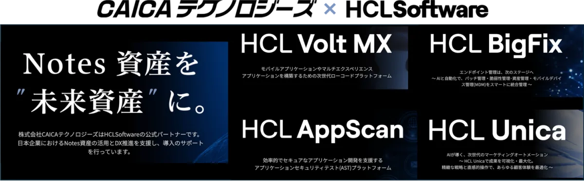 CAICAテクノロジーズが新しく設置したLPでは、以下のHCLSoftware製品に関する詳細情報を提供しています: