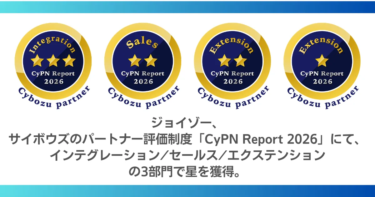株式会社ジョイゾーは、サイボウズ株式会社のオフィシャルパートナー評価制度「Cybozu Partner Network Report 2026」にて、インテグレーション、セールス、エクステンションという3つの部門で星の評価を受けました。特にインテグレーション部門では最高評価である「3つ星」を4度目に獲得し、これで5年連続の高評価となりました。