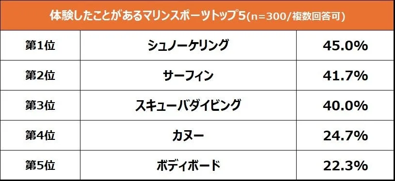 マリンスポーツの中でも最も多くの人が経験しているのは「シュノーケリング」で、45%の人が回答しました。続いて「サーフィン」(41.7%)、次いで「スキューバダイビング」(40%)と続いています。シュノーケリングは比較的手軽に楽しめる点が人気の理由と言えるでしょう。