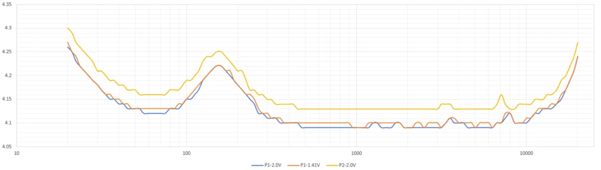 1kHz〜8kHzの中高音域において、±3dB以内の応答特性が確認され、人の声を含む音域での再生特性が安定していることが示されました。また、10kHz以上の高音域でもエネルギーを保持し、15kHz付近では明瞭な高域成分が確認できました。平面磁界型ユニットならではの高域再生特性とディテール表現が期待されます。