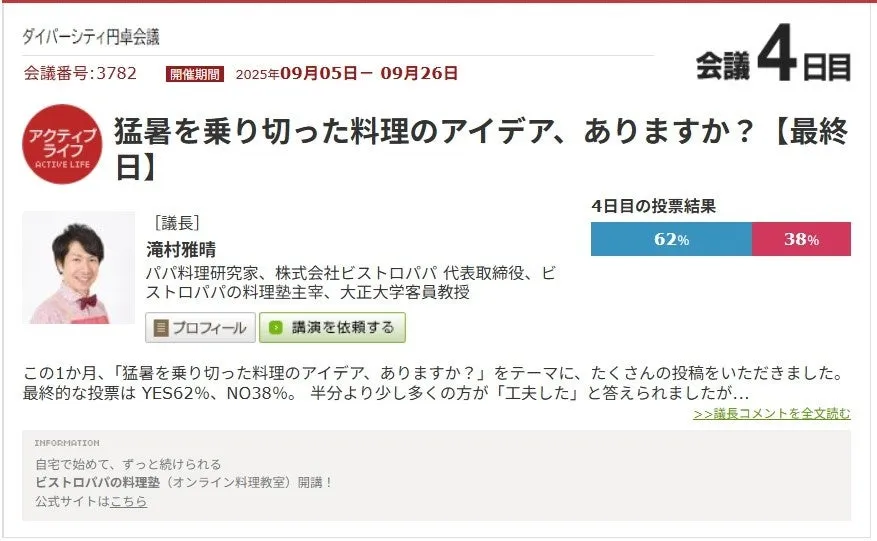 2025年9月、大勢の働く人々が参加した「ダイバーシティ円卓会議」のテーマは「猛暑を乗り切った料理のアイデア」。この会議では、パパ料理研究家であり、株式会社ビストロパパの代表取締役でもある滝村雅晴氏が議長に立ち、参加者からのアイデアを引き出しました。