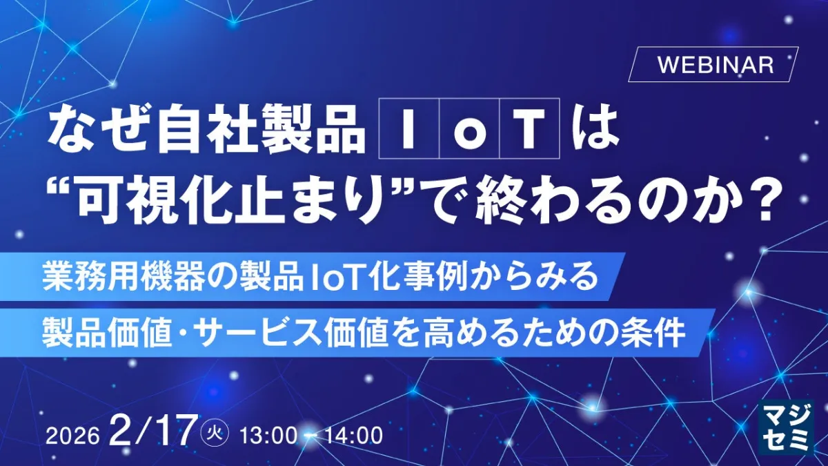 このたび開催されるウェビナーでは、自社製品のIoT化を進めている、または既に進めているものの課題を抱えている企業の方々を対象に、製品IoTを単なる可視化で終わらせず、継続的に収益化するための施策を解説します。業務用機器のIoT化に成功した事例を元に、実践的な戦略を紹介します。