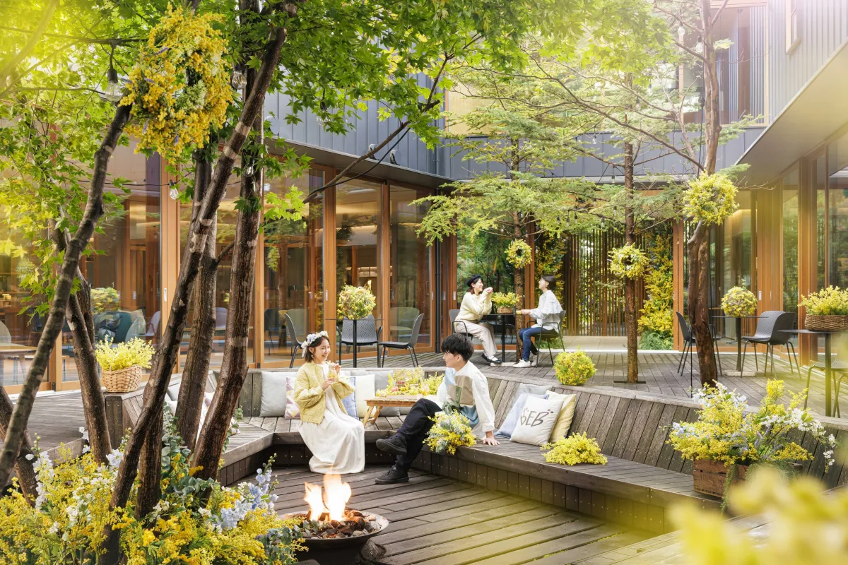 「BEBミモザスプリング」では、パブリックスペースTAMARIBAがミモザカラーに一新され、約2mのミモザアーチや花冠のフォトスポットが登場します。訪れた人たちは、ブーケを手に取ったり、花冠をかぶったりしながら、フォトジェニックな時間を過ごすことができます。中庭には自然の中に忘れられない写真を撮れるスポットがあり、まるで春の訪れを一足早く感じられるかのようです。