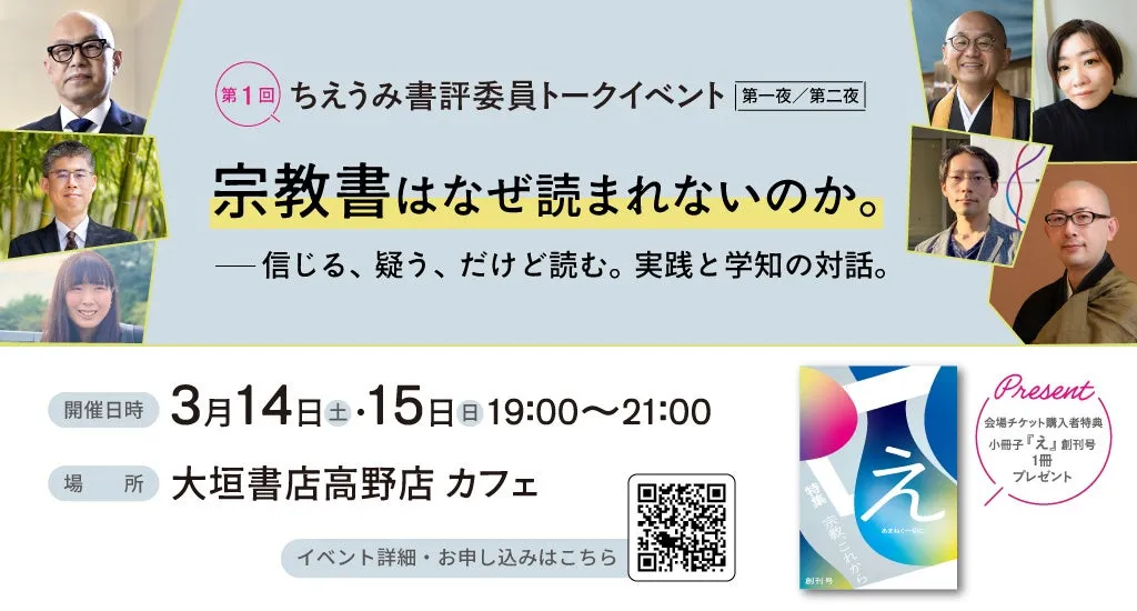 2025年4月に始動した「ちえうみ書評委員」は、仏教書を中心とした宗教・哲学書を広く紹介するため、さまざまな専門家の視点を持つ委員たちで構成されています。この委員会が主催する第1回トークイベント「宗教書はなぜ読まれないのか」は、多様な意見を持つ委員たちが、信じることや疑うことを共有しながら、文化や実践の観点から宗教書に関する対話を行います。