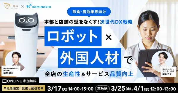 2026年3月17日、株式会社カミナシが主催するオンラインセミナー「本部と店舗の壁をなくす! 次世代DX戦略 〜ロボット活用×多国籍人材活躍で全店の生産性とサービス品質向上〜」が開催されます。このセミナーでは、飲食・宿泊業界の課題である生産性向上やサービス品質の維持に焦点を当て、具体的なDX戦略の実践事例を紹介する予定です。