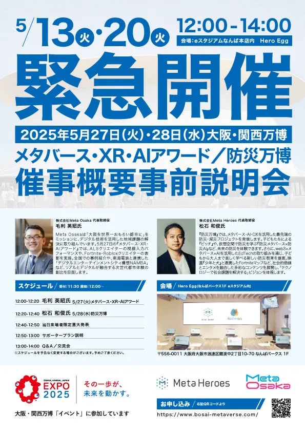 2025年5月8日、株式会社Meta Heroesは、同社のグループ会社である株式会社Meta Osakaとともに、今後開催される「メタバース・XR・AIアワード」及び「防災万博」に関する説明会を実施しました。このイベントは、2025年5月27日・28日に予定されています。