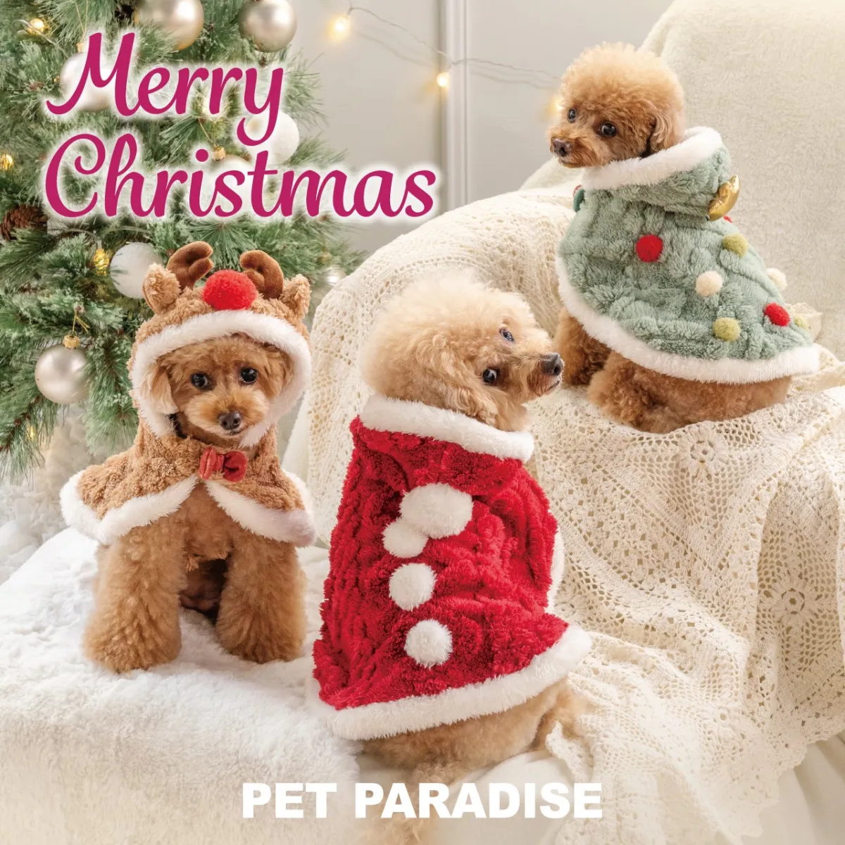 毎年大人気のクリスマスウェアが、トナカイ、サンタクロース、クリスマスツリーをテーマにしたデザインで新たに登場しました。これらのウェアは、ふわふわのボア素材を使ったポンチョタイプ。軽やかでありながらも、着させるのが簡単なデザインです。わざわざ頭を通さなくても、サッと羽織れるので、おうちの中でも気軽に楽しめます。今シーズンは全10サイズ(4S~L)を展開しているため、小型犬から大型犬までぴったりのサイズが見つかります。