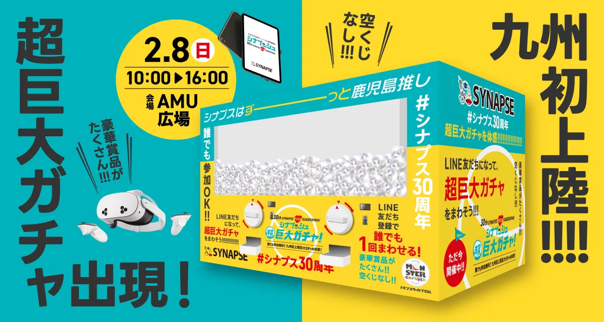 南九州の皆様に長年親しまれてきたインターネットサービスプロバイダー「シナプス」が、2026年2月8日(日曜日)に30周年を迎えるにあたり、特別な感謝イベントを開催します。このイベントの目玉は、巨大ガチャ「モンスターカプセル」です。高さ3.0メートル、幅4.5メートルの巨大なガチャマシンが、アミュプラザ鹿児島の1階屋外イベントスペースで登場します。