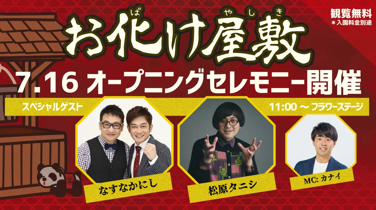 オープニングセレモニーには、お笑いコンビ「なすなかにし」のお二人と、松原タニシさんが登壇し、MCはカナイさんが務めます。セレモニーでは、新お化け屋敷の第一号のお客様として、登壇者たちが実際に『首づかの呪い』を体験し、その模様をレポートしてくれます。また、お化け屋敷をイメージした新しいフードメニューの食レポも行われる予定です。さらに、松原タニシさんが原作を手掛けたホラー映画「事故物件ゾク 恐い間取り」に関するトークタイムも配置されており、参加者の盛り上がりが期待されます。